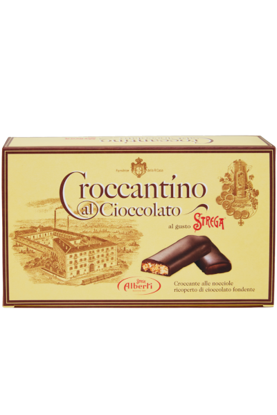 Golosa barretta ottenuta dal miglior zucchero caramellato e dalla granella delle più pregiate nocciole ricoperta da cioccolato fondente extra al gusto Strega